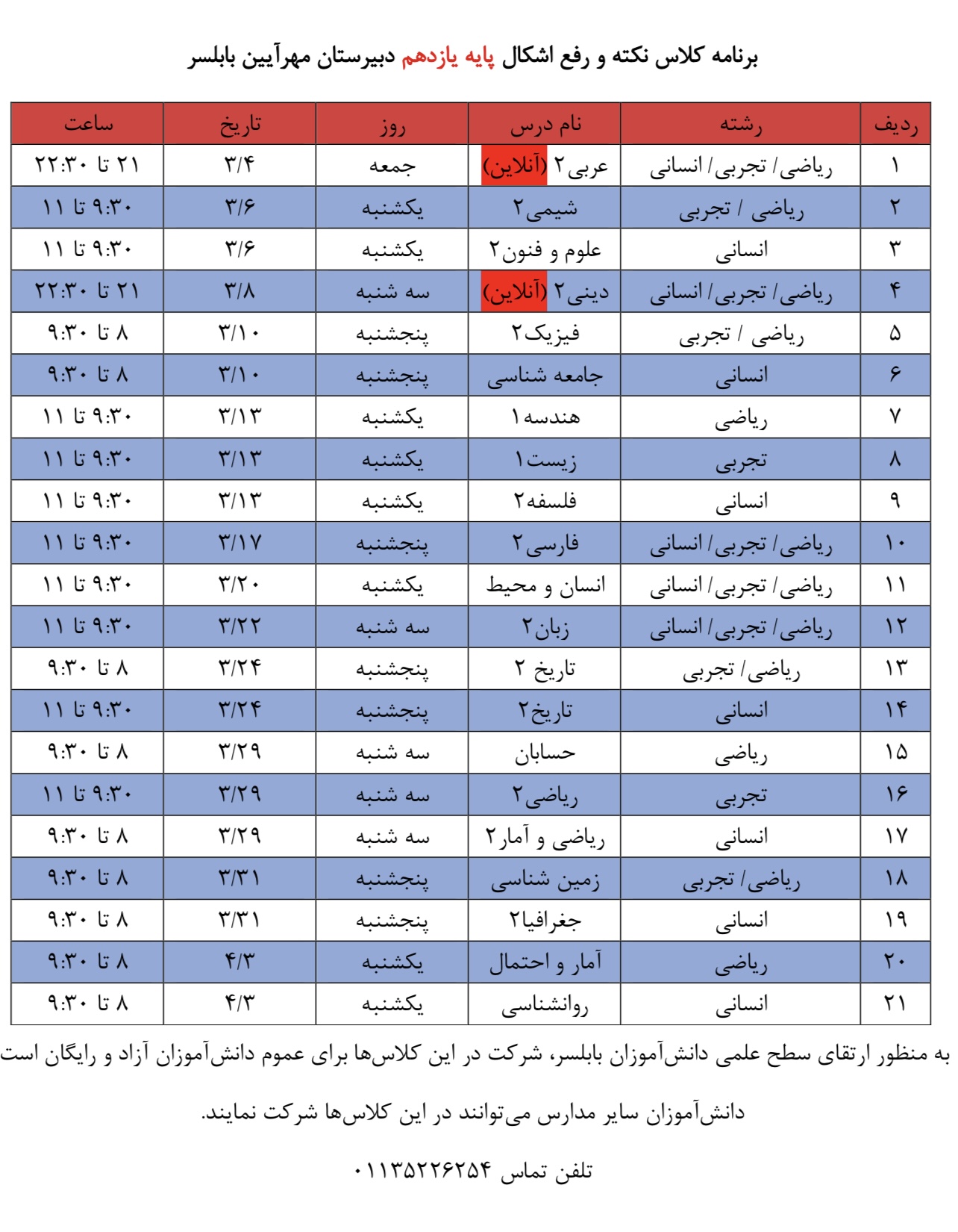 ساعات کاری مدرسه از شنبه تا چهارشنبه، ۷:۳۰ صبح تا ۱۴:۳۰ هست.